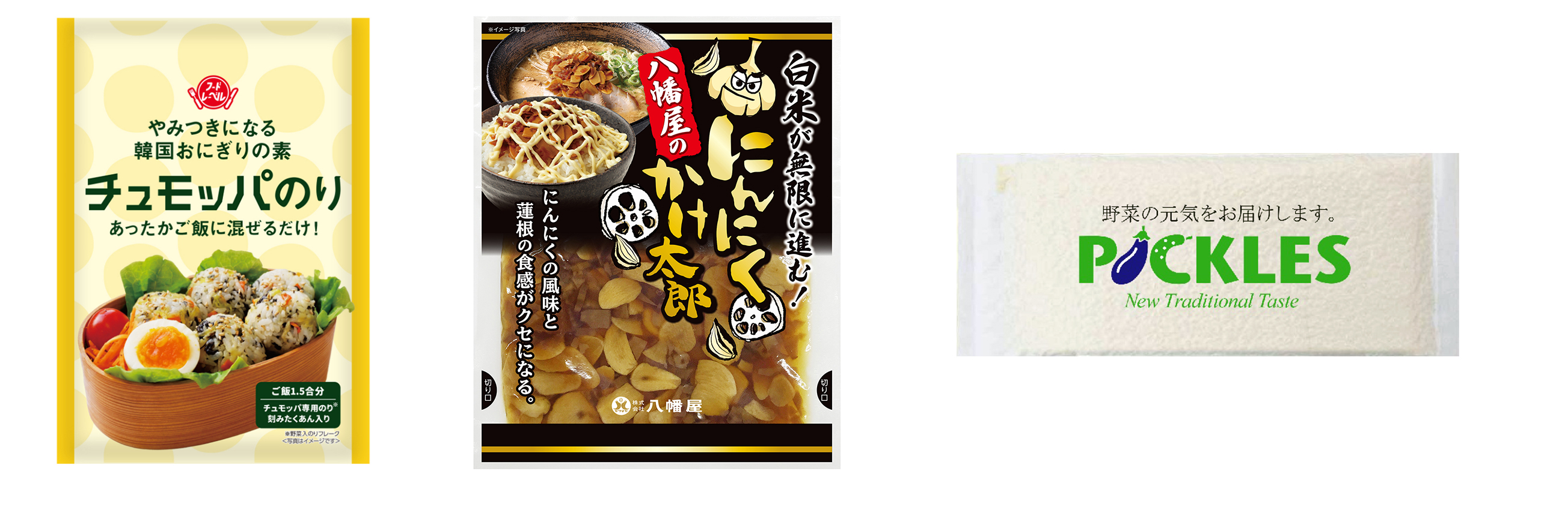 「ご飯のおともおかか生姜」、「刻み野菜のうま味噌漬」、「じっくり漬け込んだ福神漬」は八幡屋ブランドの商品です。